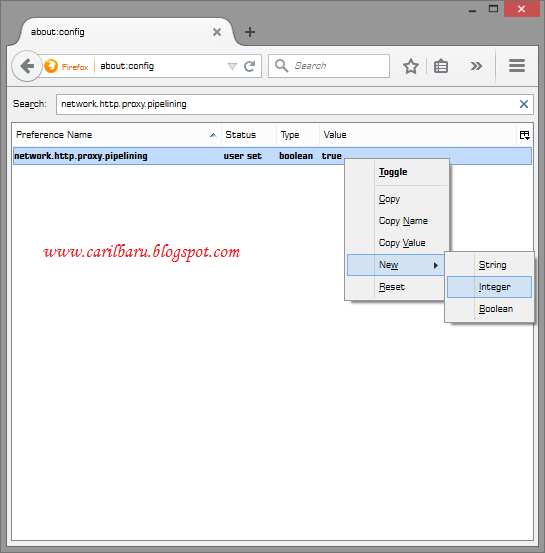 11. Yang terakhir buatlah Klik kanan -> New -> Integer. Isi dengan browser.cache.memory.capacity